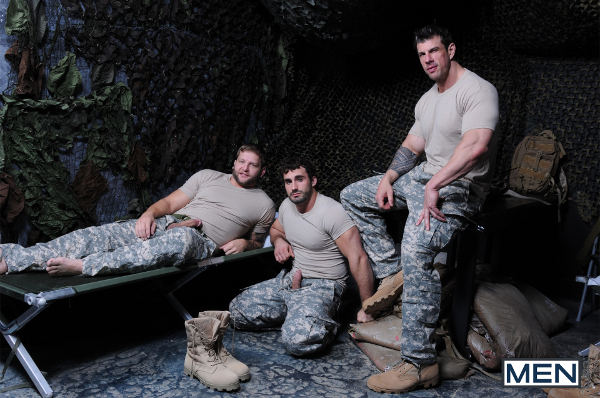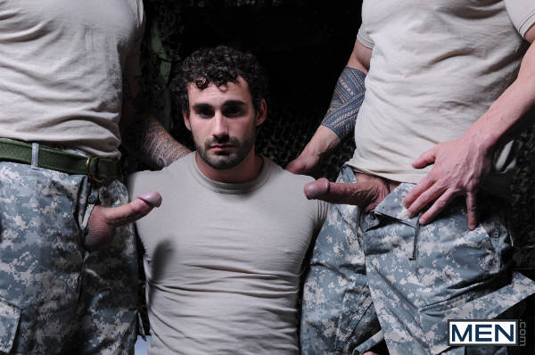 3 militaires assez balaise se reposent sous la tente . L’un d’eux à la gaule et montre sa bite , puis les deux autres font de même ..ils bandent tout  les trois et ont envie de se défouler sexuellement …rien ne vaut une petit pipe pour se donner  la pèche . Le barbu va se mettre à genoux et choper les deux sexes de ses potes pour les sucer tour à tour avec gourmandise.