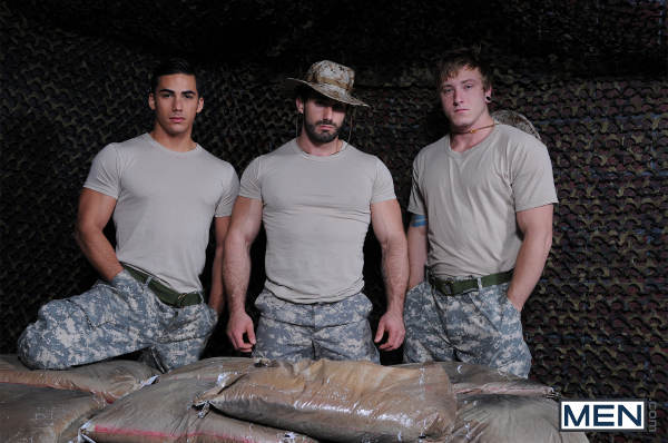 Trois soldats sont de corvées pour préparer une prochaine mission . Ils doivent inspecter le matos mais n’ont pas l’air très vaillant et décidé à bosser . Ils se touchent la bite à travers le treillis et commencent à s’exciter mutuellement . L’un d’eux ce met à genoux pour pomper la bite de son camarade puis c’est un trio très sex fellation et sodomie qui se forme .